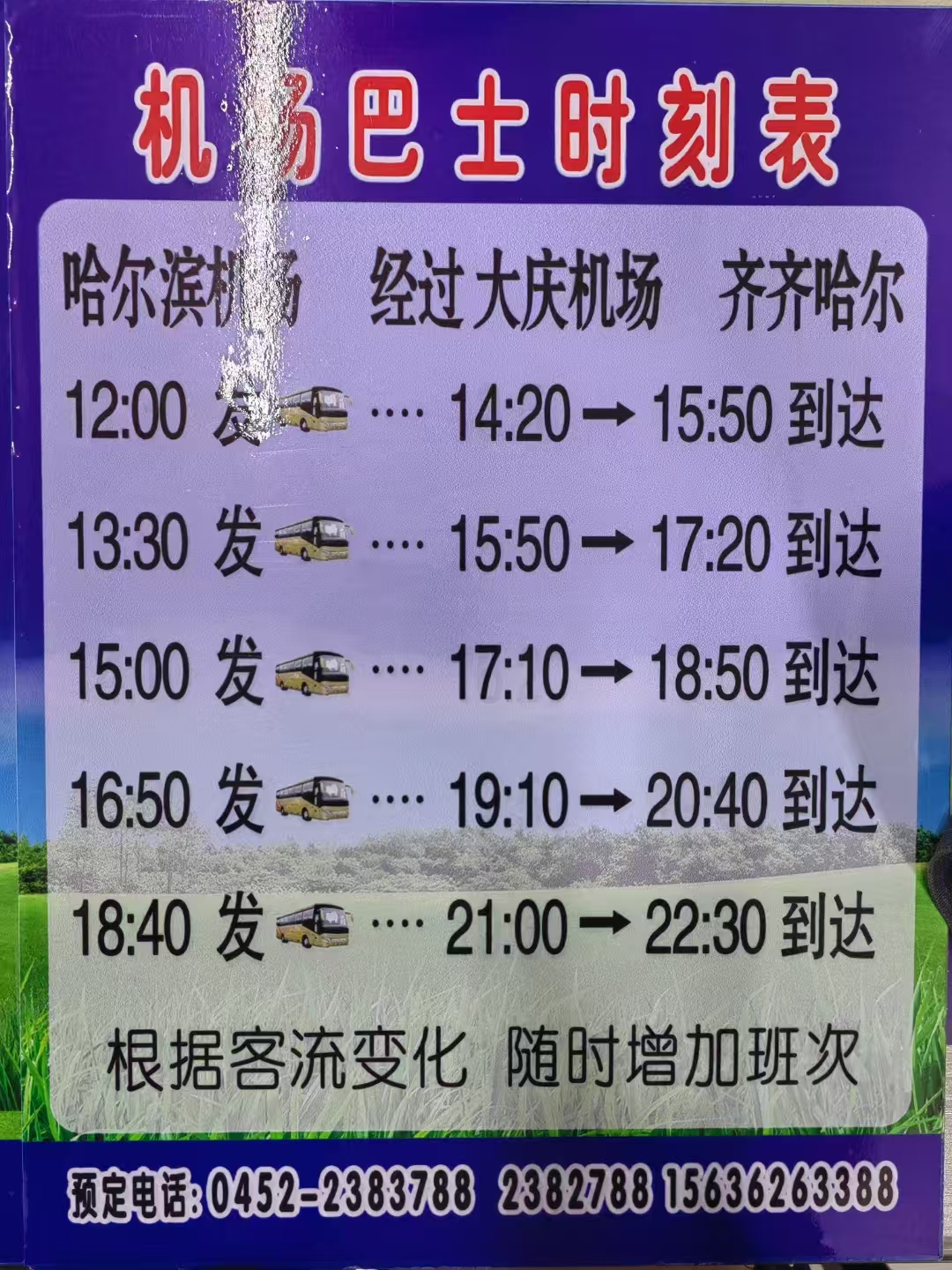 黑龍江天成運(yùn)業(yè)集團(tuán)齊齊哈爾客運(yùn)有限公司齊齊哈爾至哈爾濱機(jī)場(chǎng)巴士于2009年開(kāi)通,巴士開(kāi)通以來(lái)秉持“安全第一、服務(wù)至上”原則,真心臻誠(chéng)、專(zhuān)業(yè)服務(wù),每年運(yùn)送旅客20萬(wàn)人次。機(jī)場(chǎng)巴士配置12米35座大型高一級(jí)商務(wù)客車(chē),全承載車(chē)身、氣囊懸掛,安全舒適、便捷直達(dá)。專(zhuān)業(yè)駕駛隊(duì)伍、優(yōu)中選優(yōu),保證安全。巴士應(yīng)急全程與交警、交通、機(jī)場(chǎng)聯(lián)動(dòng),迂特殊天氣、特殊路況,應(yīng)急準(zhǔn)備充分、措施得當(dāng)、擔(dān)當(dāng)負(fù)責(zé),確保旅客利益不受傷害。機(jī)場(chǎng)巴士免費(fèi)提供代辦登機(jī)牌、代送衣物、兒童陪伴、老人看護(hù)、賓館預(yù)定服務(wù),隨身行李免費(fèi),提前退票、改簽免費(fèi),夏季礦泉水免費(fèi),當(dāng)日客票全天乘車(chē)有效,電話(huà)問(wèn)詢(xún)即可訂票,人性化服務(wù)讓您感到溫暖舒心。